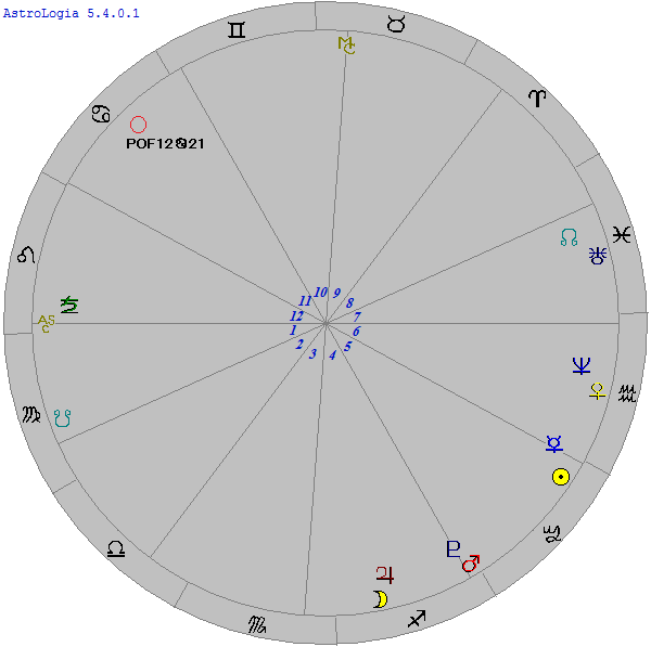 犯人は遠く、小高い場所(射手)、何か子供やパチンコなどに関係する楽しい場所(第5ハウス)にいる。パートオブフォーチュンは蟹にあり、ディスポジターは木星だが、月は光を運んでいる。パートオブフォーチュンがあり、月が支配している第5ハウスは大作さんのお友達と考えていいのではないだろうか。